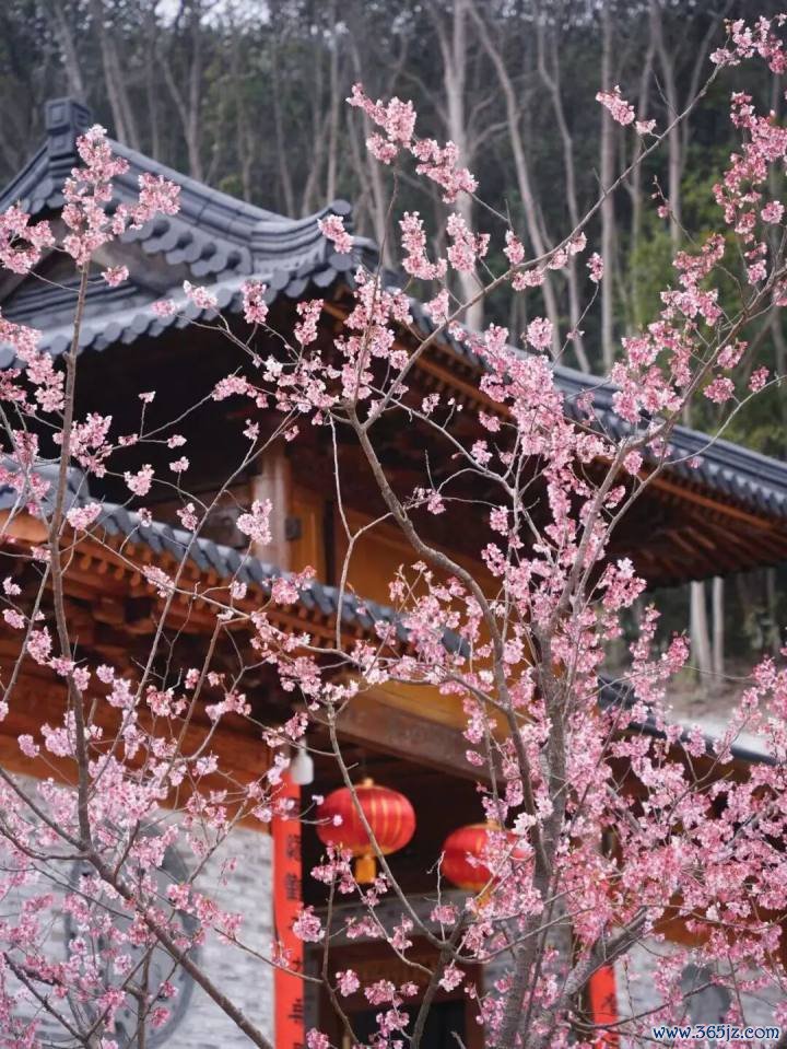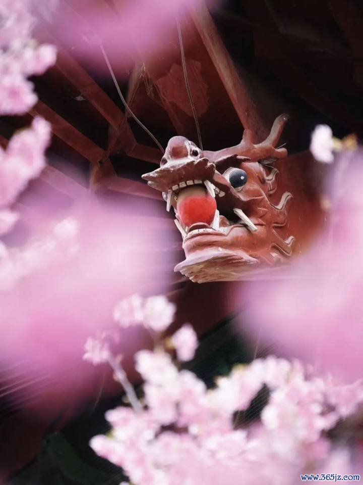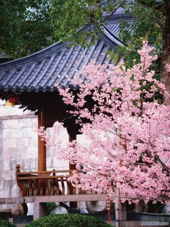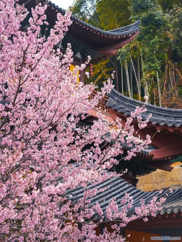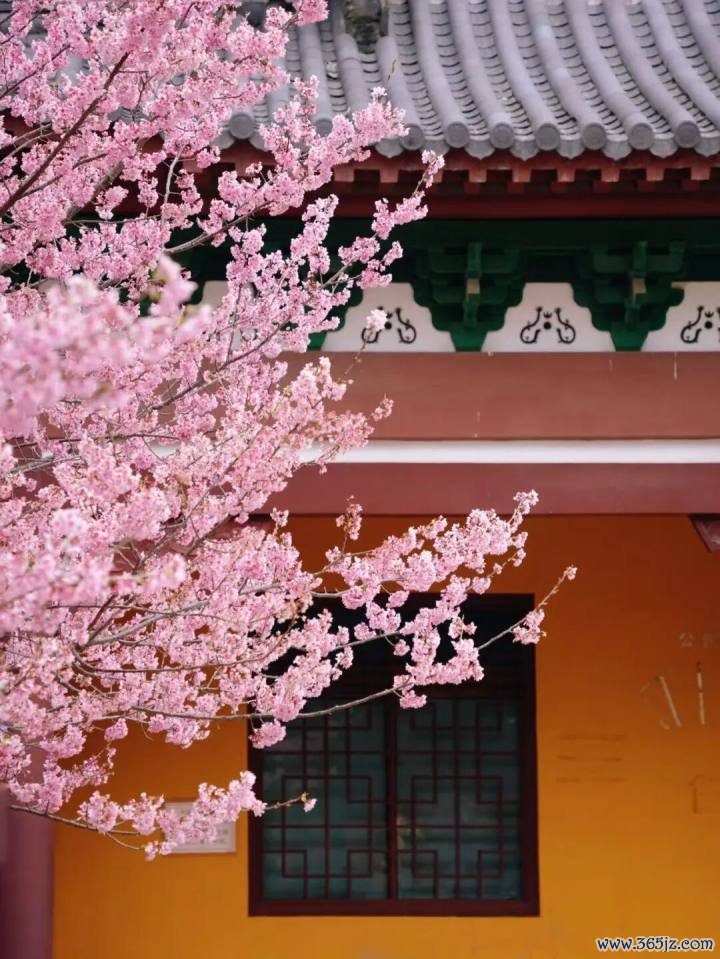 最妙的是,以寺庙的黄墙、黛瓦与飞檐为天然背景,粉色的花朵被衬托得既娇柔又庄严,构成一幅绝妙的古风画卷。