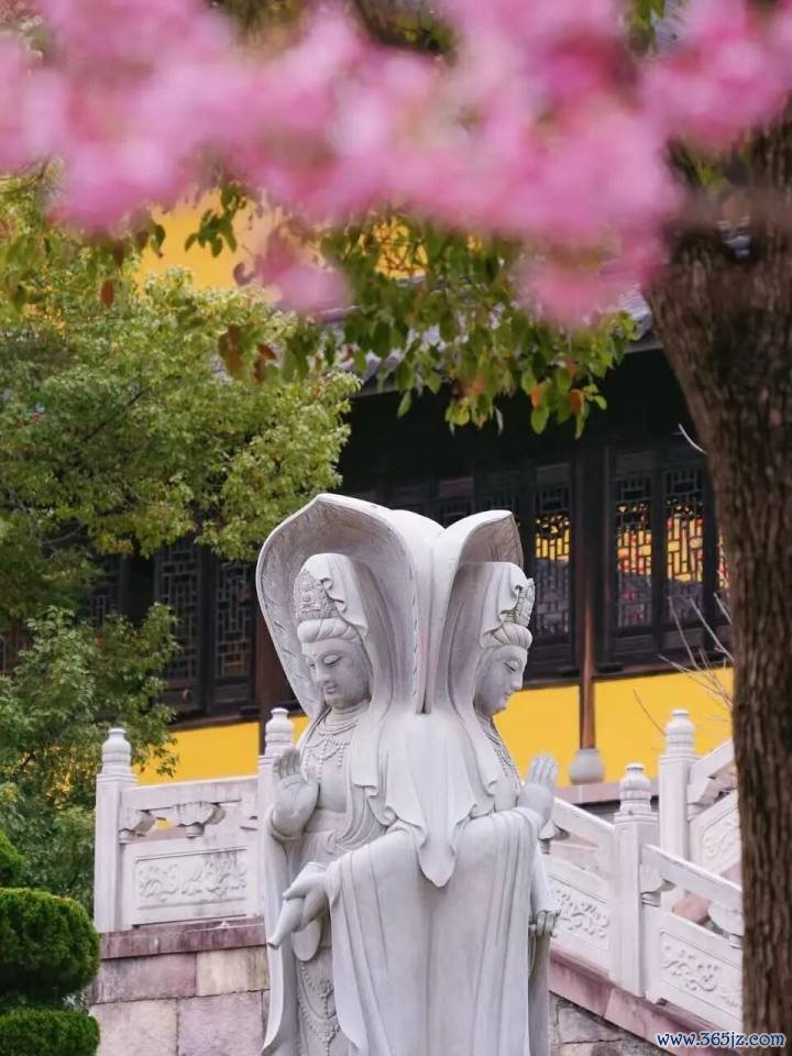 两棵樱花树背后的平台上有一座亭子,天王殿与大雄宝殿之间的广场上,还立有一尊庄严的三面观音像。